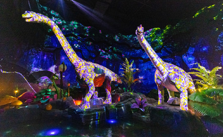 在大型室内河道(dào)漂流項目《河谷探秘》中,遊客乘坐漂流船緩緩駛入恐龍河谷,穿越瀑布流水、植被茂密的雨林秘境,近距離接觸衆多恐龍和原始生物族群。神秘的河谷氛圍,有趣的恐龍互動,引發(fā)現場遊客陣陣驚呼。