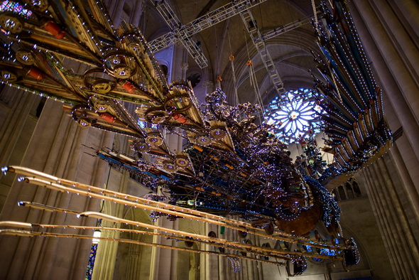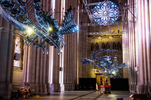 制作完成(chéng)後(hòu),徐冰選擇在紐約哥倫比亞大學(xué)對(duì)面(miàn)的聖約翰主教堂中展示自己的作品。大家知道(dào),鳳凰涅槃是中國(guó)關于生命重生的故事(shì),教堂則是西方生命重生之地,這(zhè)隻鳳凰上面(miàn)用了一些五彩斑斓的霓虹燈,這(zhè)是當代的商業文化元素,鋼鐵是西方工業革命的元素,但作品的文化内核卻是中國(guó)的。