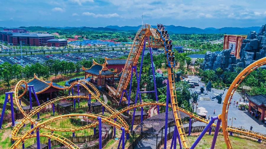 ▲過(guò)山車之夢俱樂部成(chéng)員乘坐長(cháng)沙方特東方神畫最新過(guò)山車《勇闖神界》。