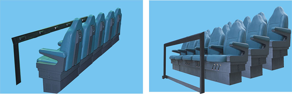 The special effects seating installed in Fantawild 4D theaters is designed in groups of three to five seats, with each seat measuring 55cm in width. The total width of a five-seat grouping is 3.5m. Both seating units may be arranged or combined to suit the needs of different theaters.