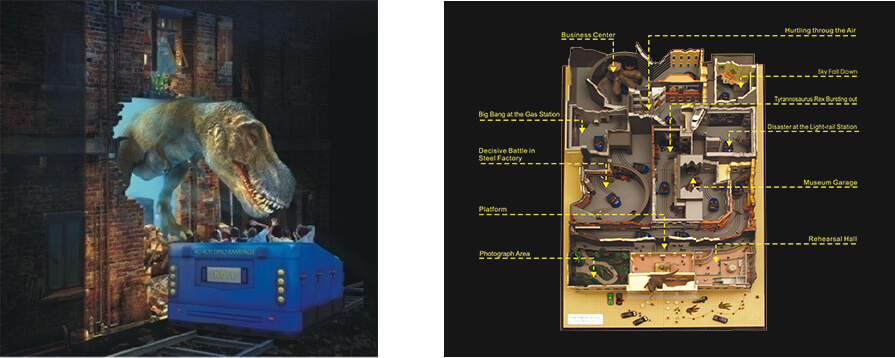4D Dark Rides are large, elaborate indoor attractions in which riders in guided vehicles travel through specially-lit scenes that typically contain animation, sound, music, and special effects. They integrate, for example, 3D animated movie scenes, dynamic-motion cars, 4D disaster simulation, and various live-performance components.