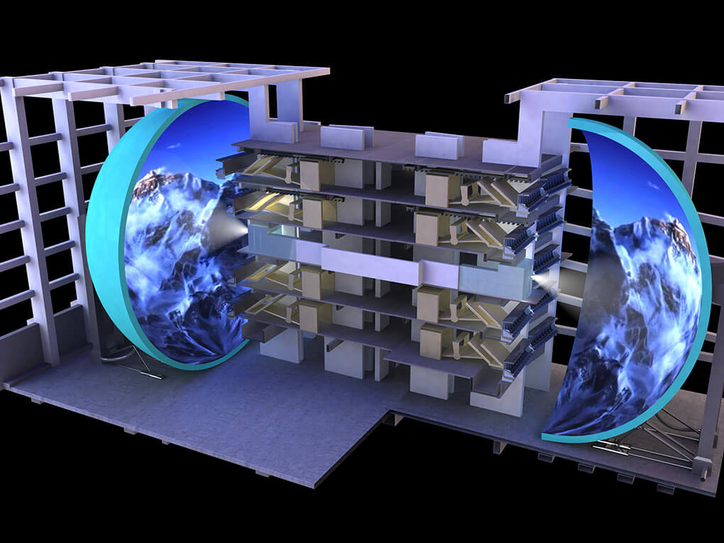 Offering spectacular 3D visuals on an expansive hemispherical screen, along with a breathtaking view from midair, the suspended spherical theater allows audiences to feel as if they can fly through the air with the greatest of ease. The suspended spherical theater's hemispherical screen is 22 meters in diameter. Two 70mm pearl-eye polarizing projectors are used to project films.