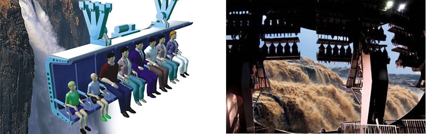 Hanging seats give visitors the feel of flying through the air. The audience experiences rushing winds and other effects, in accordance with the action unfolding onscreen.