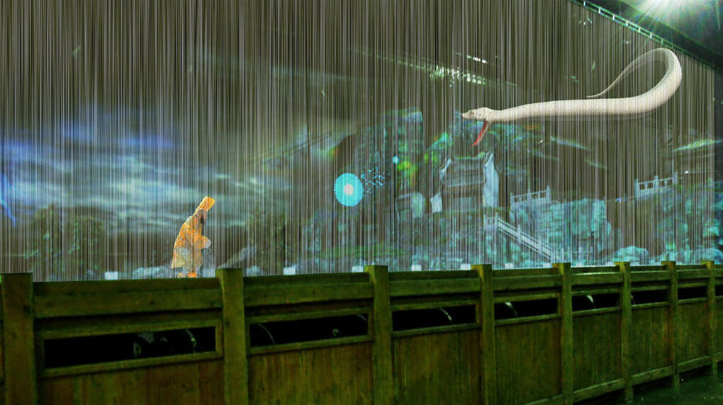 The pre-show area features an indoor drifting adventure. During that 10-minute odyssey, visitors arranged 200 to a boat find themselves in ancient Hangzhou. They are treated to a lively mix of video, live action, and interactive elements-all in service of the story of the Dragon Boat Festival. The main performance area is the actual water-screen theater, in which our technology allows "Mother Nature" to unleash her fiercest side, as described in the section above. When the featured film arrives at its epic end, the White Snake Maiden and the nefarious monk engage in heated battle at Jinshan Temple-leading to the spray from 1000 tons of rushing water reaching stunned audiences as rolling waves break forth.