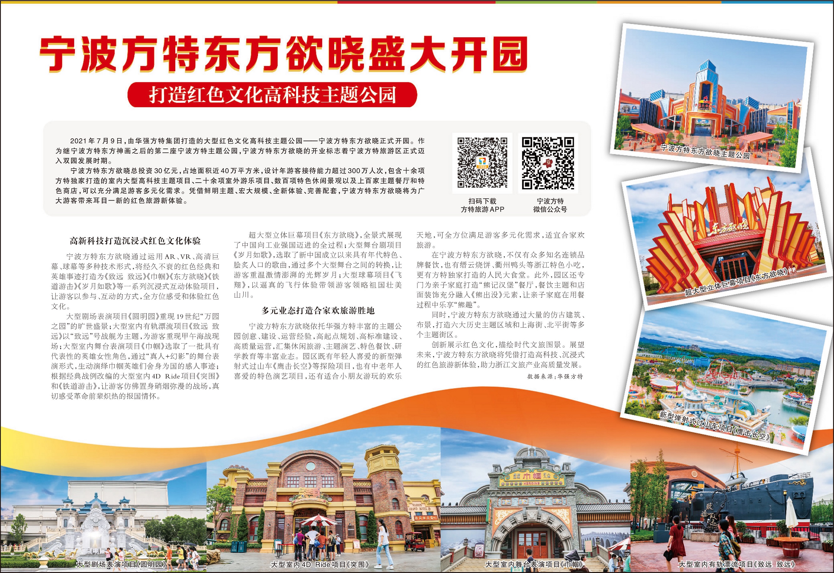 2021年7月9日,由華強方特集團打造的大型紅色文化高科技主題公園——甯波方特東方欲曉正式開(kāi)園。作爲繼甯波方特東方神畫之後(hòu)的第二座甯波方特主題公園,甯波方特東方欲曉的開(kāi)業标志著(zhe)甯波方特旅遊區正式邁入雙園發(fā)展時(shí)期。甯波方特東方欲曉總投資30億元,占地面(miàn)積近40萬..