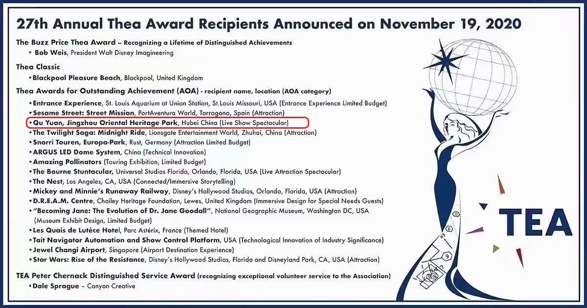 美國(guó)當地時(shí)間11月19日,國(guó)際主題娛樂協會(huì)(TEA)公布了第27屆Thea大獎名單,華強方特集團旗下荊州方特東方神畫主題樂園的大型真人演藝特效劇場項目——《屈原》榮獲2020年度“傑出成(chéng)就(jiù)獎”。據悉,成(chéng)立于1991年的主題娛樂協會(huì)(ThemedEntertainmentAssociation:TEA)作..